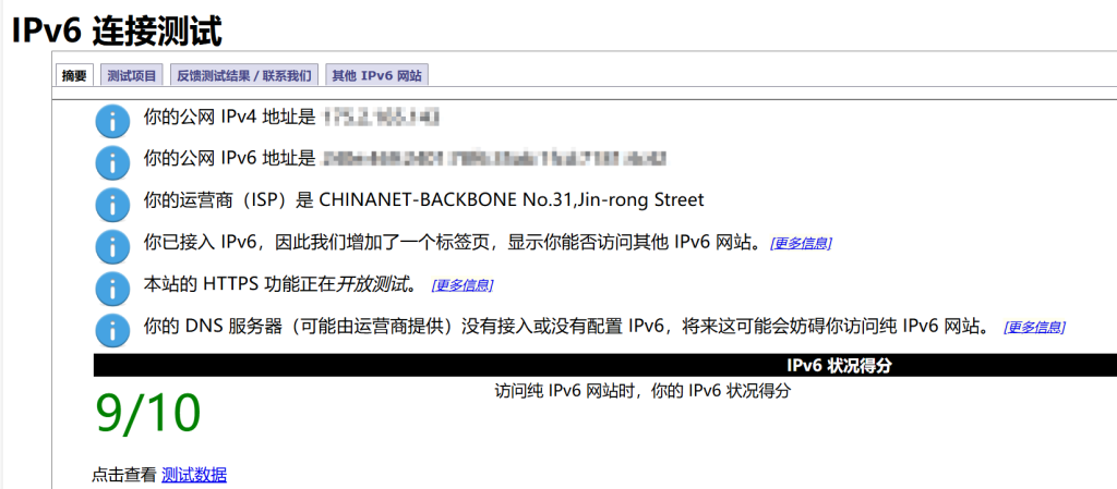 显示如下则表明拥有ipv6(测试为9影响不大)